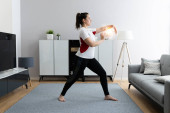 Zdjęcie "Młoda brunetka kobieta w aktywnym ubraniu utrzymując jedną rękę rozciągnięty podczas ćwiczeń fizycznych z hantlami podczas oglądania wideo online" może być wykorzystywane do celów osobistych i komercyjnych zgodnie z warunkami zakupionej licencji Royalty-free. Obraz jest dostępny do pobrania w jakości wysokiej rozdzielczości do 5760x3840.