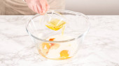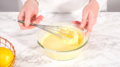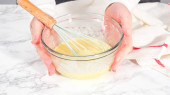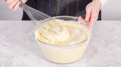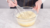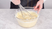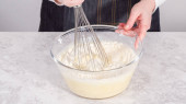 Krok po kroku. Składniki mieszania w szklanej misce do przygotowania naleśników z bananem kokosowym.