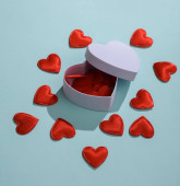 Drewniany kalendarz z datą 14 lutego i serca na niebieskim tle. Koncepcja miłosna, Walentynki, 14 lutego świętowanie, twórczy układ