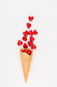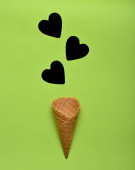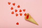 Stożek waflowy z sercami na niebieskim tle. Koncepcja miłosna, Walentynki, 14 lutego świętowanie, twórczy układ