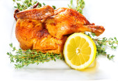 Pieczony kurczak z przyprawami i warzywami na talerzu na białym tle