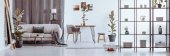 Wnętrze pokoju z drewnianą szafką i regałami w pobliżu białej ściany