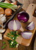 Deska z plasterkami świeżego szalotki i cebuli na ciemnym tle