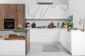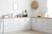 Wnętrze jasnej kuchni ze stylowym stołem na wyspie