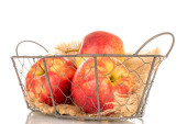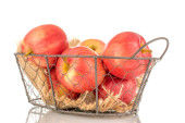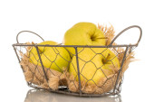 Kilka jasnożółtych gruszek w koszyku, makro, odizolowanych na białym tle.