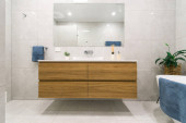 Zdjęcie "Nowoczesny przestronny luksusowy remont łazienki" może być wykorzystywane do celów osobistych i komercyjnych zgodnie z warunkami zakupionej licencji Royalty-free. Obraz jest dostępny do pobrania w jakości wysokiej rozdzielczości do 5760x3840.