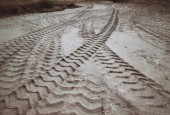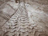 ślady kół na glebie.