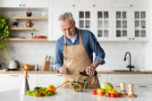 Zdjęcie "Spragniony starszy mężczyzna wylewający wodę z dzbanka do szklanki we wnętrzu kuchni, portret uśmiechniętego starszego pana pijącego zdrowy płyn w domu, cieszącego się orzeźwiającym drinkiem, przestrzeń do kopiowania" może być wykorzystywane do celów osobistych i komercyjnych zgodnie z warunkami zakupionej licencji Royalty-free. Obraz jest dostępny do pobrania w jakości wysokiej rozdzielczości do 5760x3840.