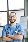 częściowy widok profesjonalnego brodatego instruktora medycznego w niebieskim mundurze stojącego ze skrzyżowanymi ramionami i stetoskopem na szyi w szpitalu, seminarium szkoleniowe z pierwszej pomocy i koncepcja gotowości na wypadek awarii