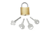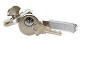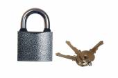 Zamknięta kłódka z kluczami do niego na białym tle.