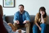 Zdjęcie "Młoda przygnębiona kobieta korzystająca z chusteczki podczas wizyty u psychologa z mężem" może być wykorzystywane do celów osobistych i komercyjnych zgodnie z warunkami zakupionej licencji Royalty-free. Obraz jest dostępny do pobrania w jakości wysokiej rozdzielczości do 5760x3840.