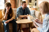 Młoda przygnębiona kobieta korzystająca z chusteczki podczas wizyty u psychologa z mężem