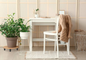 Przytulne wnętrze pokoju ze stylowymi białymi meblami, lampą biurkową i pięknymi elementami dekoracyjnymi
