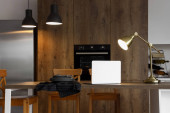 Wnętrze nowoczesnej kuchni ze świecącymi lampami i laptopem na stole na wyspie