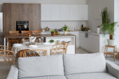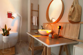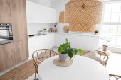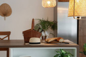 Kapelusz, wiklinowy kosz i świeży chleb na drewnianym stole wyspiarskim w nowoczesnej kuchni z świecącymi lampami