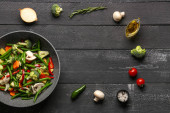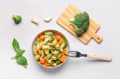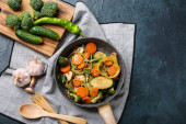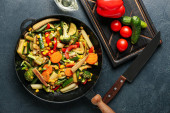 Patelnia ze świeżymi warzywami na szarym tle