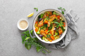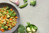 Zdjęcie "Patelnia ze świeżymi warzywami na szarym tle" może być wykorzystywane do celów osobistych i komercyjnych zgodnie z warunkami zakupionej licencji Royalty-free. Obraz jest dostępny do pobrania w jakości wysokiej rozdzielczości do 5760x3840.