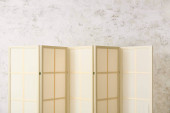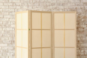 Stylowa drewniana komoda w pobliżu jasnej cegły ściany w pokoju