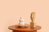 Drewniana komoda w pobliżu niebieskiej ściany w pokoju