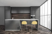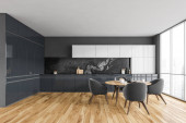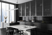 Zdjęcie "Ciemne wnętrze kuchni ze stołem i krzesłami na drewnianej podłodze, częścią kuchenną i panoramicznym oknem na drapacze chmur. Plakat z płótna. Renderowanie 3D" może być wykorzystywane do celów osobistych i komercyjnych zgodnie z warunkami zakupionej licencji Royalty-free. Obraz jest dostępny do pobrania w jakości wysokiej rozdzielczości do 5760x3840.