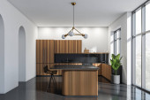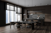 Zdjęcie "Ciemny salon z jadalnią, krzesłami i stołem. Drzwi od łuku i kanapa na dywanie. Panoramiczne okno na drapacze chmur. Renderowanie 3D" może być wykorzystywane do celów osobistych i komercyjnych zgodnie z warunkami zakupionej licencji Royalty-free. Obraz jest dostępny do pobrania w jakości wysokiej rozdzielczości do 5760x3840.