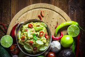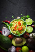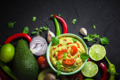 Tło z guacamole i składniki: pomidor, papryka chili, wapno, cebuli, czosnku, koperek i oregano