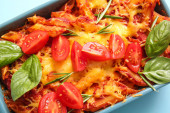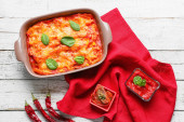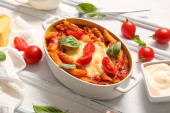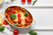 Danie do pieczenia makaronu z sosem pomidorowym i serem na białym tle