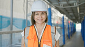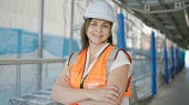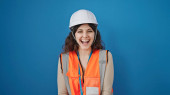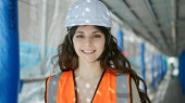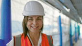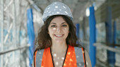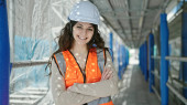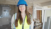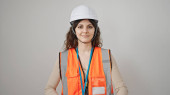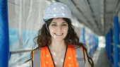 Młoda piękna latynoska budowniczka uśmiecha się pewnie stojąc na ulicy