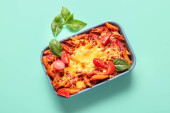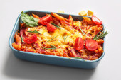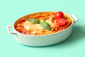 Naczynie do pieczenia makaronu z sosem pomidorowym i serem na różowym tle