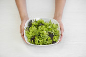 Dieta i dieta, smacznego. Zdrowa kobieta trzyma sałatkę i czuje się szczęśliwa. Piękno szczupła kobieta ciało osiąga cel odchudzania dla zdrowego życia, szalony o szczupłość, cienka talia, dietetyk