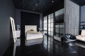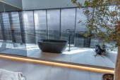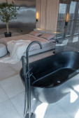 nowoczesne minimalistyczne wnętrze pokoju w stylu japońskim w kolorze beżowym i czarnym. stylowo odczepiona łazienka przy ogromnym oknie panoramicznym z żaluzjami