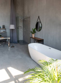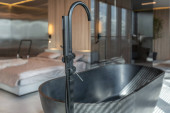 Zdjęcie "nowoczesne minimalistyczne wnętrze pokoju w stylu japońskim w kolorze beżowym i czarnym. stylowo odczepiona łazienka przy ogromnym oknie panoramicznym z żaluzjami" może być wykorzystywane do celów osobistych i komercyjnych zgodnie z warunkami zakupionej licencji Royalty-free. Obraz jest dostępny do pobrania w jakości wysokiej rozdzielczości do 5760x3840.