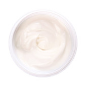 Jogurt śmietankowy, w drewnianej misce. Mieszany jogurt, również jogurt lub jogurt, o zawartości tłuszczu 10%. Produkt mleczarski, wytwarzany w drodze fermentacji bakteryjnej głównie mleka krowiego z wykorzystaniem kultur jogurtowych.