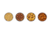 Małe gnocchi, surowe, gotowane i z sosem pomidorowym, w białych miskach. Gnocchini to włoskie pierogi, bryłki ciasta, z ziemniaków, mąki pszennej, jaj i soli, gotowane w słonej wodzie, ubrane w sos.