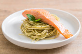 Dziki filet z łososia z pietruszką, warzywa cukinii i pomidory na lekkiej płycie i rustykalnym drewnianym stole, zdrowa dieta niskowęglowodanowa, wysoki kąt widzenia z góry, przestrzeń kopiowania, wybrane skupienie