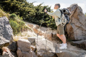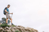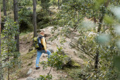 Zdjęcie "Widok z boku młodej krótkowłosej kobiety turystki z plecakiem i sprzętem podróżniczym odwracając wzrok stojąc na wzgórzu z drewnianym płotem i naturą na tle, turysta wędrujący po krajobrazie" może być wykorzystywane do celów osobistych i komercyjnych zgodnie z warunkami zakupionej licencji Royalty-free. Obraz jest dostępny do pobrania w jakości wysokiej rozdzielczości do 5760x3840.