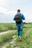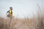 Widok z boku młodej krótkowłosej kobiety turystki z plecakiem i sprzętem podróżniczym odwracając wzrok stojąc na wzgórzu z drewnianym płotem i naturą na tle, turysta wędrujący po krajobrazie