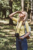 Wesoły młody krótkowłosy kobieta podróżnik z fitness tracker i plecak ze sprzętem podróżnym patrząc w kamerę, stojąc w pobliżu drewnianego ogrodzenia z naturą w tle, lato