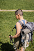 Zdjęcie "Wesoły młody krótkowłosy kobieta podróżnik z fitness tracker i plecak ze sprzętem podróżnym patrząc w kamerę, stojąc w pobliżu drewnianego ogrodzenia z naturą w tle, lato" może być wykorzystywane do celów osobistych i komercyjnych zgodnie z warunkami zakupionej licencji Royalty-free. Obraz jest dostępny do pobrania w jakości wysokiej rozdzielczości do 5760x3840.