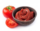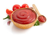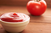 Miska smacznego ketchupu i pomidora na drewnianym stole, zbliżenie