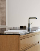 Zbliżenie kuchenny marmurowy blat na zamazany tło kuchnia z przyrząd i naczynie koło okno z zielony roślina. 3d renderowanie