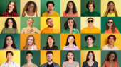 Kolaż. Portrety młodych ludzi w różnym wieku, płci i rasy patrzących przed kamerą na kolorowe tło w neonowym świetle. Pojęcie ludzkich emocji, młodości, stylu życia, wyrazu twarzy. Ogłoszenie