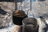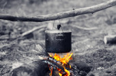 Gotowanie w dwóch starych garnkach sadzy na ognisku w słoneczny letni dzień