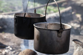 Zdjęcie "Gotowanie w dwóch starych garnkach sadzy na ognisku w słoneczny letni dzień" może być wykorzystywane do celów osobistych i komercyjnych zgodnie z warunkami zakupionej licencji Royalty-free. Obraz jest dostępny do pobrania w jakości wysokiej rozdzielczości do 5760x3840.