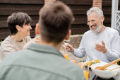 wesoły mężczyzna w średnim wieku patrząc syn i gestykulując podczas imprezy BBQ, rozmyty pierwszy plan, siedząc na podwórku letniego domu, spędzając czas razem, jedząc grillowane jedzenie BBQ, koncepcja dzień rodziców