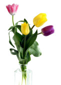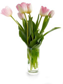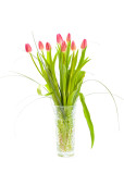 posy ładny różowy tulipany w szklanym wazonie izolowane zbliżenie