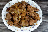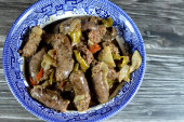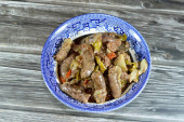 Kuchnia egipska smażonych kostek ziemniaka następnie gotowane z mielonego mięsa wołowego z oliwą, czosnkiem, cebulą, pomidorami i pieprzem serwowane w talerzu izolowane na drewnianym tle, selektywne skupienie