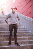 szczęśliwy Święty Mikołaj w masce ochronnej na twarzy i z telefonem