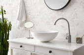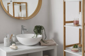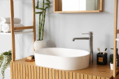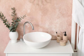 Zdjęcie "Zlewozmywak z akcesoriami do kąpieli na stole w łazience" może być wykorzystywane do celów osobistych i komercyjnych zgodnie z warunkami zakupionej licencji Royalty-free. Obraz jest dostępny do pobrania w jakości wysokiej rozdzielczości do 5760x3840.