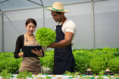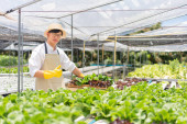 Zdjęcie "Afrykańska grupa amerykańska sprawdza kolejność i zbiera warzywa do skrzyni w szklarni hydroponicznej." może być wykorzystywane do celów osobistych i komercyjnych zgodnie z warunkami zakupionej licencji Royalty-free. Obraz jest dostępny do pobrania w jakości wysokiej rozdzielczości do 5760x3840.